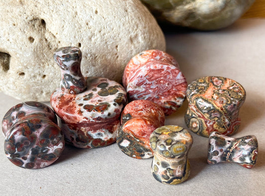 PAIR of Unique Natural Leopard Jasper Stone Double Flare Organic Plugs Tunnels Gauges Body Jewelry