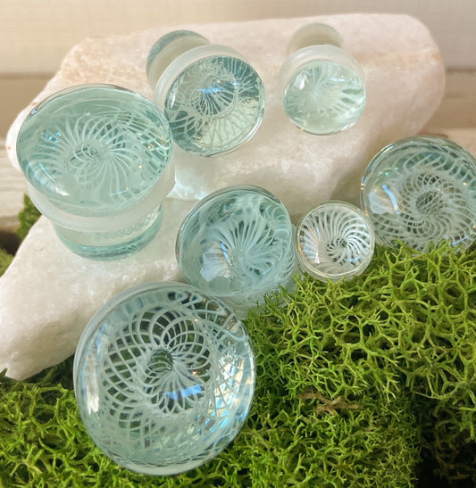 PAIR of Beautiful White Spiral Weave Design Pyrex Glass Single Flare Plugs with O-Rings - Gauges 2g (6mm) through 5/8" (16mm)