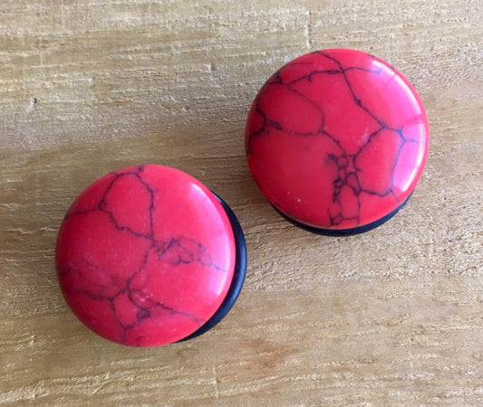 PAIR of Single Flare Red Turquoise Stone Plugs with O-Rings Tunnels Gauges Body Jewelry