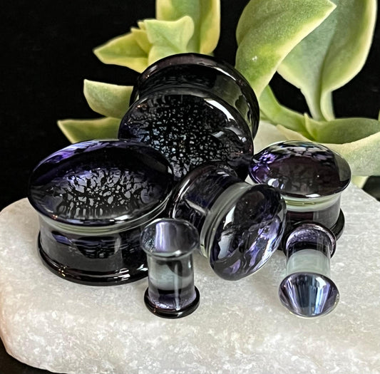 PAIR of Stunning Purple & Black Fracture Design Glass Double Flare Plugs - Gauges 2g (6mm) through 3/4" (19mm)