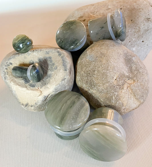 PAIR of Beautiful Organic Single Flare Green Jasper Stone Plugs with O-Rings - Gauges 4g (5mm) up to 5/8" (16mm)