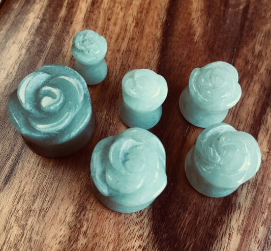 PAIR of Carved Green Aventurine Stone Rose Flower Double Flare Plugs