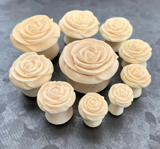 PAIR of Stunning Blooming Rose Flower Organic Wood Plugs/Tunnels - Gauges 2g (6mm) up to 1" (25mm)