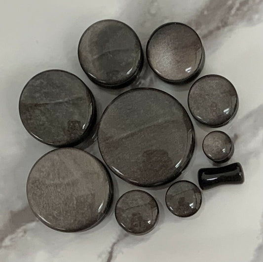 PAIR of Stunning Silver Obsidian Organic Double Flare Stone Plugs - Gauges 4g (5mm) up thru 1" (25mm)