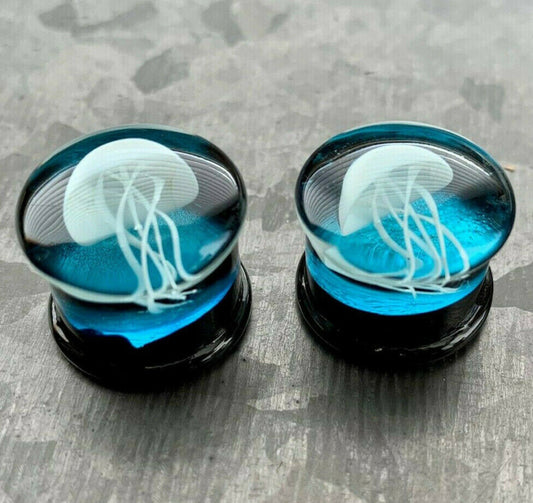 PAIR of Stunning Floating Jellyfish Design Pyrex Glass Double Flare Plugs -Gauges 0g (8mm) through 1" (25mm)