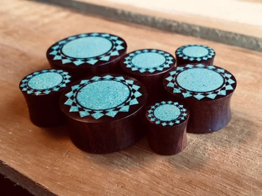 PAIR of Crushed Turquoise Tribal Sunburst Inlaid Sono Wood Saddle Plugs - Gauges 00g (10mm) through 1" (25mm)