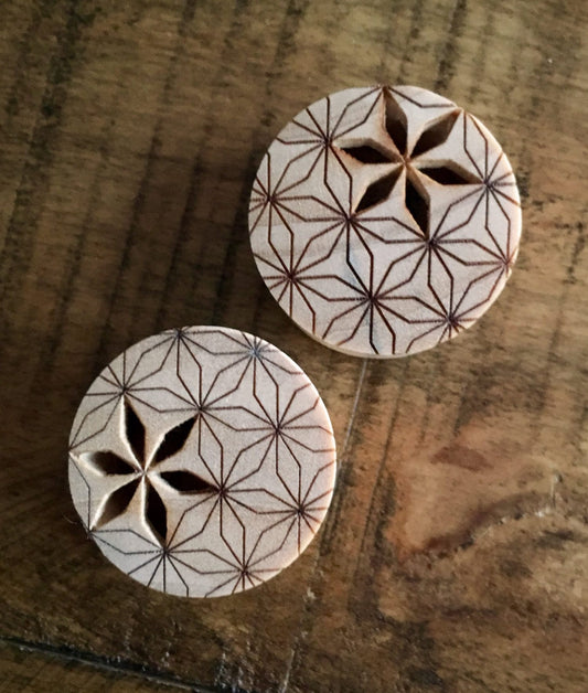 PAIR of Flower of Life Cut Out Blonde Crocodile Wood Saddle Plugs - Gauges 00g (10mm) up to 1" (25mm)
