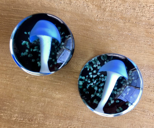 PAIR of Glow in the Dark Floating Mushroom Pyrex Glass Double Flare Plugs - Gauges 2g (6mm) through 5/8" (16mm)