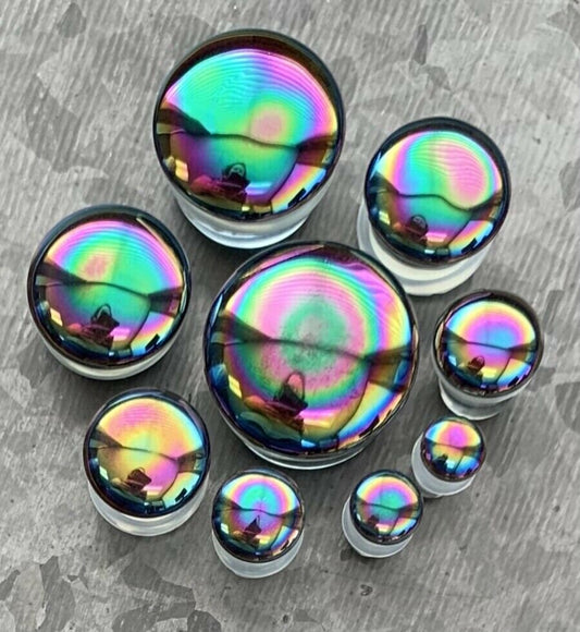 PAIR of Beautiful Oil Slick Design Pyrex Glass Single Flare Plugs with O-Rings - Gauges 4g (5mm) thru 7/8" (22mm)