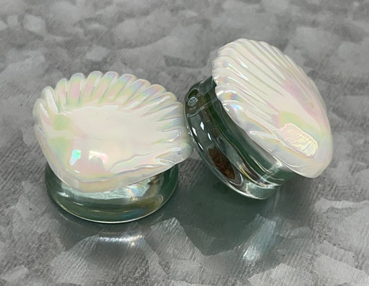PAIR of Unique White Pearl Seashell Glass Double Flare Tunnels Plugs