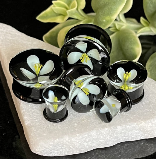 PAIR of Unique Floating Flower Black Pyrex Glass Double Flare Plugs- Gauges 0g (8mm) thru 3/4" (19mm)