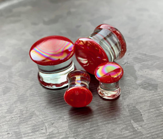 PAIR of Red Fire Pearl Design Pyrex Glass Double Flare Plugs