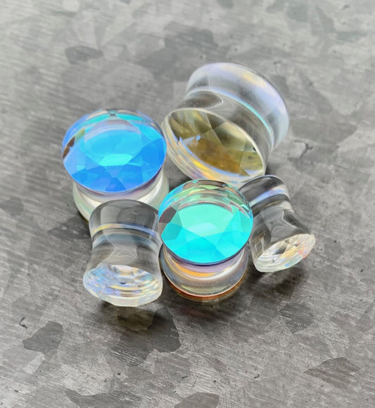 PAIR of Stunning Faceted Iridescent Glass Double Flare Plugs