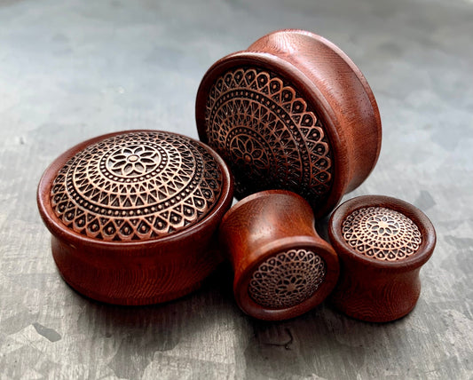 PAIR of Unique Organic Rose Wood with Flower Lattice Pattern Saddle Plugs - Gauges 2g (6mm) up to 1" (25mm)