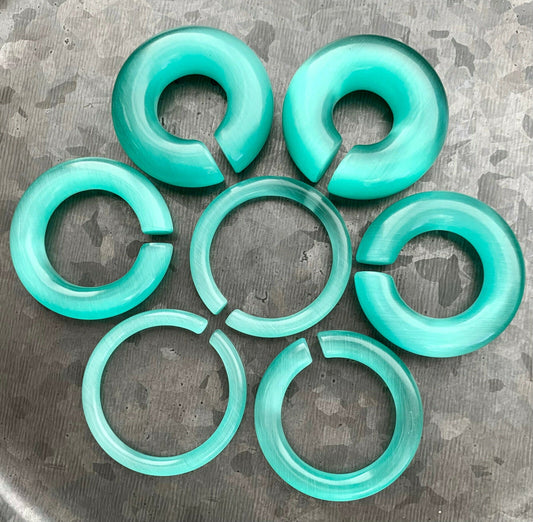 PAIR of Stunning Aquamarine Cat Eye Large Stone/Glass Hoops Ear Weight Hanging Plugs & O-rings -Gauges 4g (5mm) up to 5/8" (16mm)
