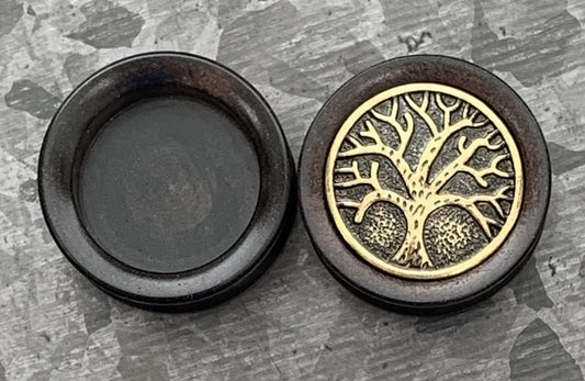 PAIR of Beautiful Organic Ebony Wood Plugs with Tree of Life Top Saddle Plugs - Gauges 2g (6mm) up to 1" (25mm)