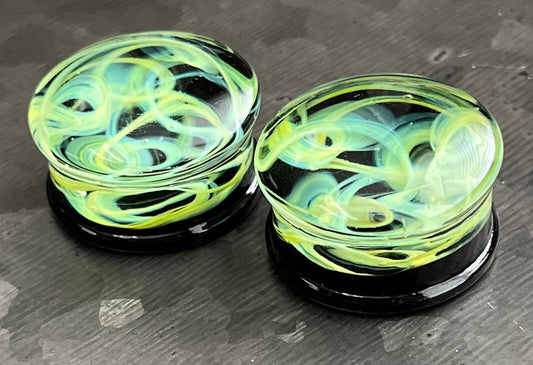 PAIR of Green Swirling Smoke Style Pyrex Glass Double Flare Plugs - Gauges 2g (6mm) through 1" (25mm)