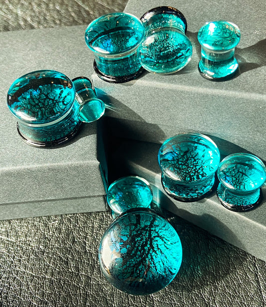 PAIR of Beautiful Aqua & Black Fracture Design Glass Double Flare Plugs - Gauges 2g (6mm) through 3/4" (19mm)