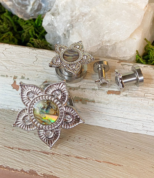 PAIR of Stunning Abalone Centered Tribal Flower Screw Fit Tunnels/Plugs - Gauges 8g (3.2mm) thru 5/8" (16mm)