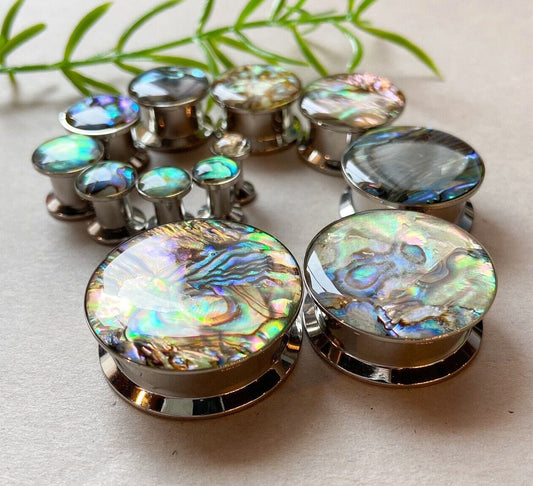 PAIR of Unique Abalone Inlay Steel Screw Fit Plugs - Gauges 8g (3.2mm) thru 1" (25mm)