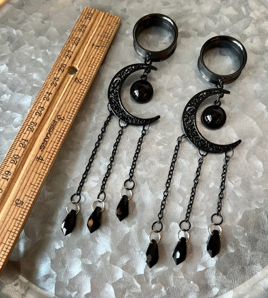 PAIR of Unique Black Filigree Moon Dangle Internally Threaded Dangle Screw Fit Tunnels -Gauges 2g (6mm) thru 1" (25mm)