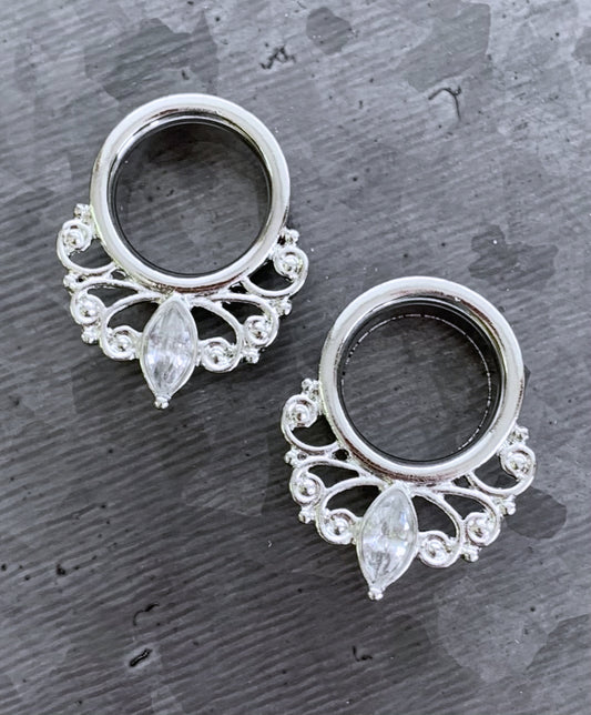 PAIR of Marquise Crystal Vintage Filigree Drop Single Flare Tunnels/Plugs - Gauges 4g (5mm) thru 16g (5/8") includes O-rings!