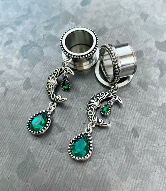 PAIR of Unique Emerald Green Stone Moon Dangle Screw Fit Tunnels/Plugs - Gauges 2g (6mm) thru 5/8" (16mm)