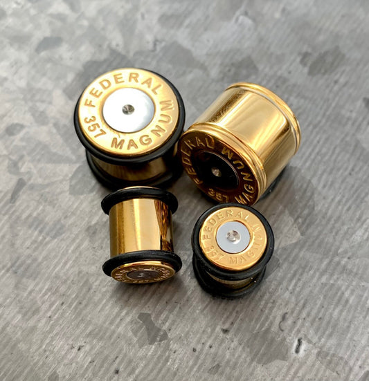 PAIR of Unique Gold Ion Plated 357 Magnum Bullet Plugs/Tunnels with O-Rings - Gauges 2g (6mm) thru 5/8" (16mm)