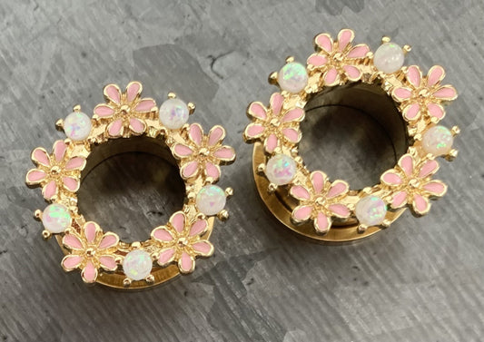 PAIR of Stunning Opal Glitter & Enamel Flowers Gold Screw Fit Tunnels/Plugs - Gauges 2g (6mm) thru 5/8" (16mm)
