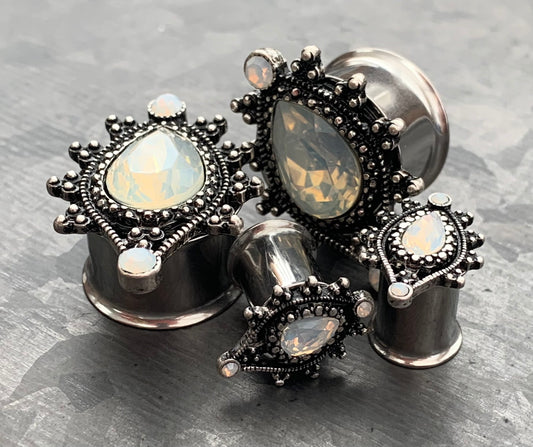 PAIR of Unique Vintage Antique Silver Top Faceted Opalite Teardrop Double Flare Tunnels/Plugs - Gauges 2g (6mm) thru 5/8" (16mm)
