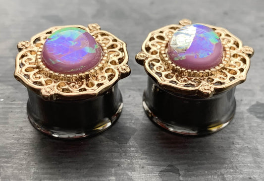 PAIR of Stunning Gold Tribal Plated Surgical Steel Plugs with a Center Pink Synthetic Opal - Gauges 2g (6mm) thru 5/8" (16mm)