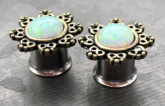 PAIR of Stunning Internally Threaded Lotus Flower with Opal Double Flare Tunnels/Plugs - Gauges 8g (3mm) thru 00g (10mm)
