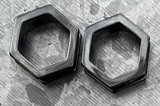 PAIR of Unique Hexagon Black Screw Fit Tunnels - Gauges 8g (3.2mm) thru 1" (25mm)