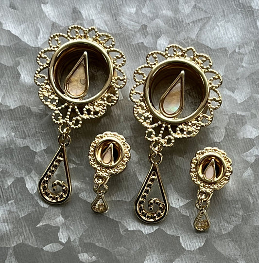 PAIR of 14kt Gold Plated Mother of Pearl Filigree Dangle Internally Threaded Double Flare Tunnel - Gauges!
