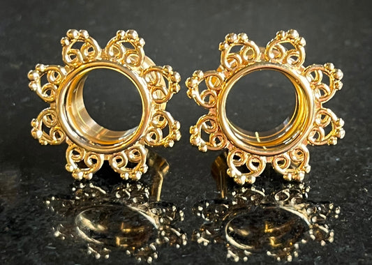 PAIR of Unique Gold Tribal Hearts Filigree Internally Threaded Double Flare Tunnels - Gauges 8g (3mm) thru 5/8" (16mm)