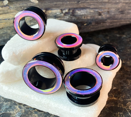 PAIR of Beautiful Rainbow Iridescent Rimmed Black Screw Fit Tunnels/Plugs - Gauges 0g (8mm) thru 5/8" (16mm)