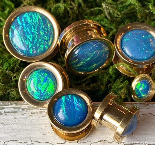 PAIR of Stunning Synthetic Blue Opal Gold Screw Fit Tunnels/Plugs - Gauges 2g (6mm) thru 5/8" (16mm)