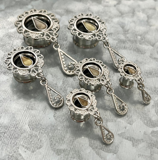 PAIR of Unique Teardrop Mother of Pearl Centered Filigree Dangle Steel Internally Threaded Tunnels Plugs Gauges Body Jewelry