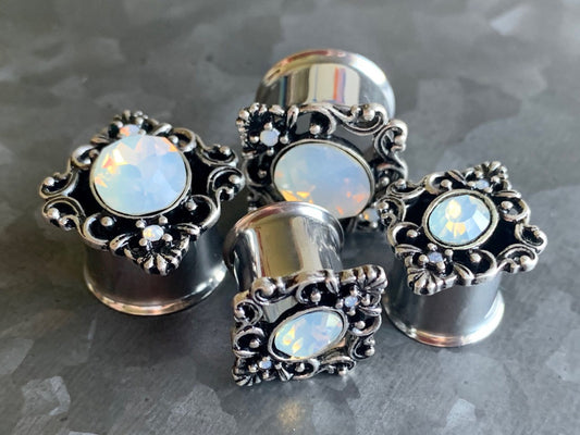 PAIR of Stunning Oval Opalite Stone Filigree Double Flare Steel Tunnels/Plugs - Gauges 2g (6mm) thru 5/8" (16mm)
