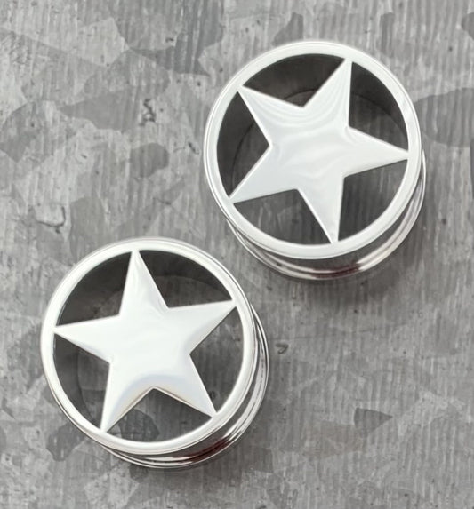 PAIR of Stunning Surgical Steel Star Screw Fit Tunnels / Plugs - Silver or Black - Gauges 2g (6mm) thru 1" (25mm)