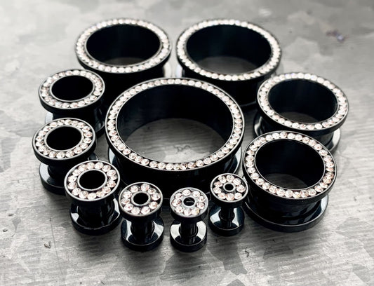 PAIR of Stunning CZ Gem Rimmed Screw Fit Black PVD Steel Tunnels - Gauges 10g (3mm) thru 1" (25mm)