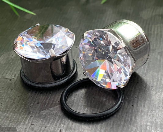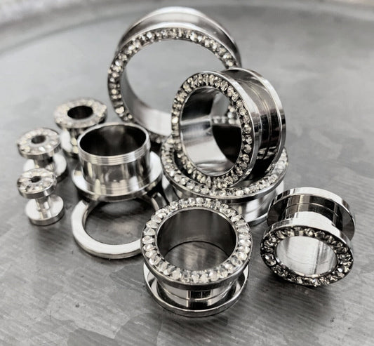 PAIR of Stunning Epoxy over CZ Gem Rim 316L Surgical Steel Screw Fit Tunnel/Plugs - Gauges 8g (3.2mm) thru 15/16" (24mm)