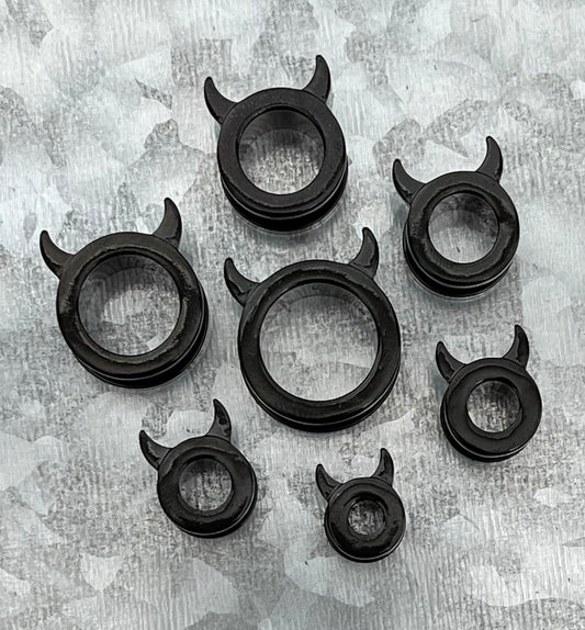 PAIR of Unique Devil Horns Black PVD Steel Screw Fit Tunnels Plugs - Gauges 2g (6mm) thru 5/8" (16mm)