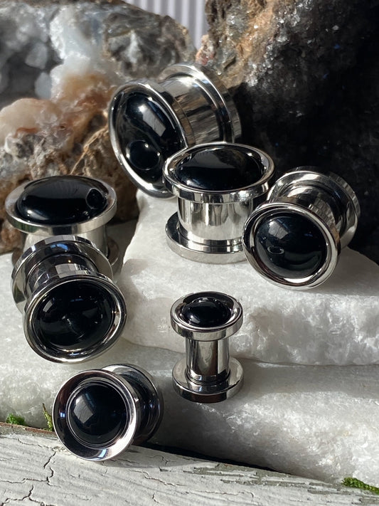 PAIR of Stunning Onyx Stone Dome Steel Screw Fit Tunnels/Plugs - Gauges 2g (6mm) thru 5/8" (16mm)