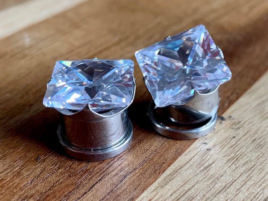 PAIR of Stunning Large Square CZ Gem Steel Screw Fit Tunnels/Plugs - Gauges 8g (3.2mm) thru 1/2" (12mm)