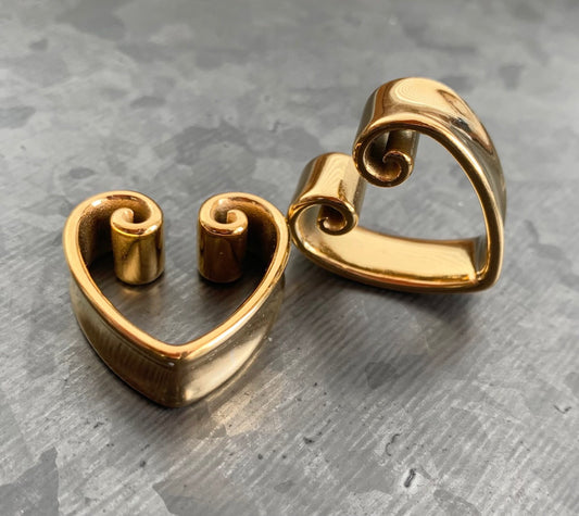 PAIR of Beautiful Vintage Heart Steel Double Flare Saddle Tunnels/Plugs - Silver, Gold & Black - Gauges 00g (10mm) thru 1" (25mm)