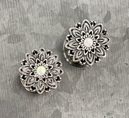 PAIR of Stunning Antique Silver Lotus with Opal Center Surgical Steel Double Flare Tunnels - Gauges 2g (6mm) thru 5/8" (16mm)