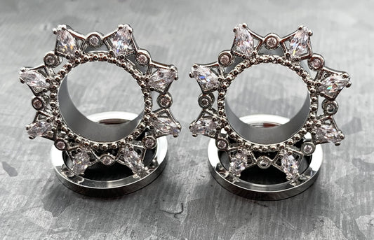 PAIR of Unique Marquise CZ Gem Filigree Steel Screw Fit Tunnels/Plugs - Gauges 2g (6mm) thru 5/8" (16mm)