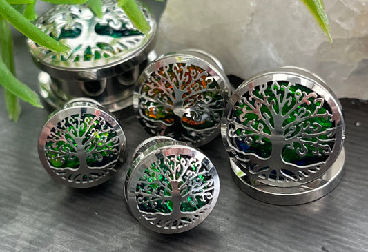 PAIR of Stunning Green Opal Glitter Tree of Life Steel Screw Fit Tunnels/Plugs - Gauges 0g (8mm) thru 5/8" (16mm)