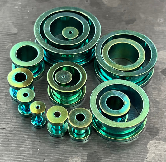 PAIR of Stunning Green PVD Plated 316L Steel Screw Fit Tunnels/Plugs - Gauges 14g (1.6mm) thru 1" (25mm)